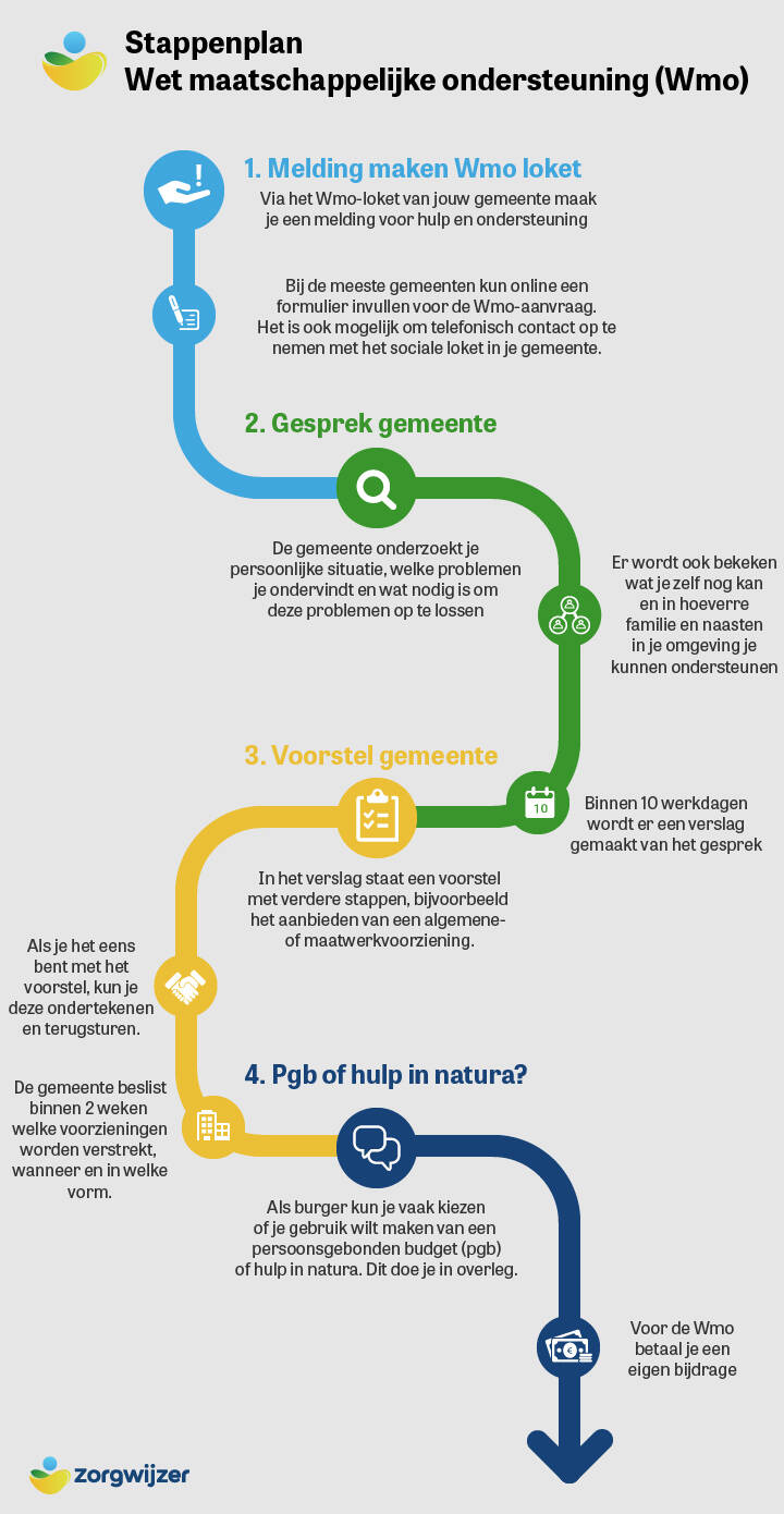 Deze wet is gericht om mensen mee te laten doen in de maatschappij en in de staat te stellen thuis te blijven wonen. Via rechtstaand stappenplan kan men lezen hoe een aanvraag te doen voor de WMO.